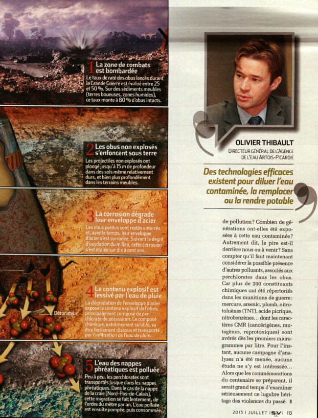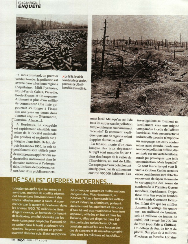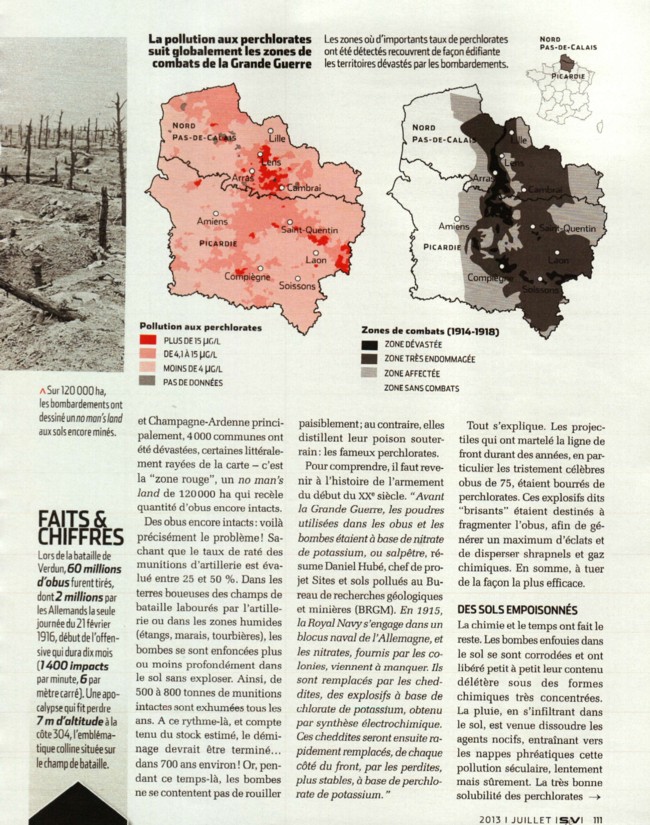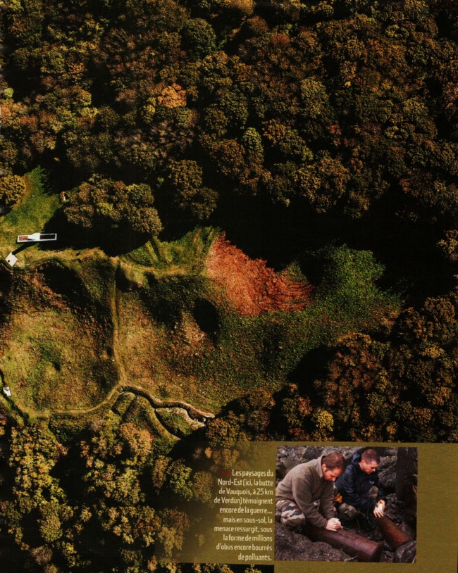 ![]() La vérité inavouable du fond du puits A la fin de la première guerre mondiale, la France s'est retrouvée avec des stocks monstrueux, et l'armée a employé diverses méthodes pour s'en débarasser. L'une des plus célèbres, en 1920 : 200 000 obus désamorcés ont été brûlés à l'air libre dans la plaine de Woëvre, près de Verdun. Un siècle plus tard ils polluent encore les sols où il est possible de relever 176g d'arsenic par kilo de terre, soit mille fois plus que la normale. Et l'Arsenic s'infiltre dans les cours d'eau. En 1923, pour éliminer un stock d'obus non utilisés ou non explosés durant la Première Guerre mondiale, l'armée française vide en une semaine dans le trou de Jardel des wagons remplis de munitions pour canons. Des centaines d'obus pesant entre 3,4 kg et 100,5 kg et de calibres variés (75 à 240 mm) sont entassés sur une quinzaine de mètres de hauteur. Les rails de chemin de fer arrivaient jusqu'au bord du gouffre et les wagons vidaient leur chargement.