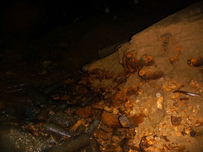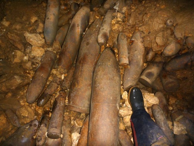 ![]() Le gouffre de Jardel Cette cavité, l'une des plus grandes verticales d'Europe, est donc également connue pour être l'une des plus grandes décharges militaires du pays. Plus de 3000 obus y auraient été planqués.