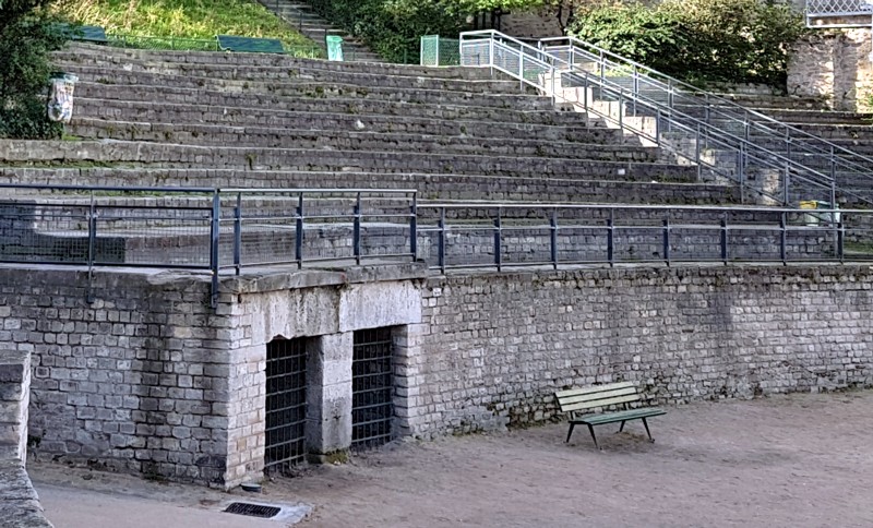 Les gradins dont il ne subsiste que la partie basse, s’appuient sur la façade arrière des immeubles de la rue Monge. Leur emplacement permettait aux spectateurs de jouir d’une vue dominante sur la Bièvre et la Seine, avec dans le lointain, les collines de Ménilmontant et Belleville. De nos jours, la vue environnante me semble biaisier par beaucoup d'immeubles non gallo-romains ... Lorsque l’enceinte était utilisée en tant qu’arènes, c’étaient pour des combats de gladiateurs, des exécutions ou des combats de fauves. Les fauves étaient maintenus avant leur entrée en scène derrière des grilles. On peut toujours en apercevoir deux de nos jours, ... mais rassurez-vous point de fauves à l'horizon, tout au mieux des chaises et du matériel d'entretien !
