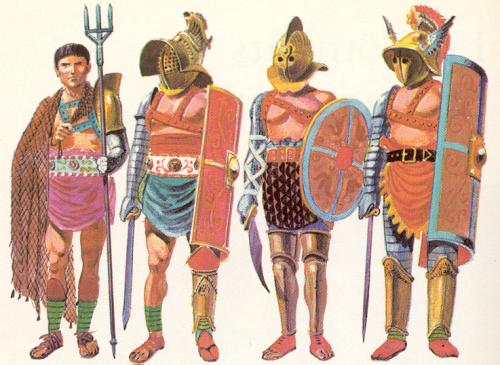 ![]() Les gladiateurs étaient des hommes destinés à donner aux Romains le spectacle de combats singuliers ("gladius" en latin signifie "glaive"). Le glaive n'était pas la seule arme du gladiateur, diverses catégories de gladiateurs se distinguaient par leur équipement, leurs moyens d'attaque et de défense, leur façon de combattre. Ainsi peut-on citer l'homoplaque (bouclier rond et lance), le provocator (dague courte, bouclier romain et casque), le secutor (glaive, bouclier long, casque et jambière), le retiaire (filet plombé, trident et poignard), le mirmillon (dague, bouclier romain, casque à crête percussive, le thrace (dague courbe, petit bouclier, jambières et casque à rebord), le samnite (longue épée, casque et bouclier celtique), ...