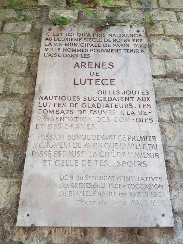 ![]() une phrase de cette plaque retient mon attention : "les arènes de Lutèce où les joutes nautiques succédaient aux luttes de gladiateurs, les combats de fauves à la représentation des comédies et des drames." Bon, comédies et drames, ok !