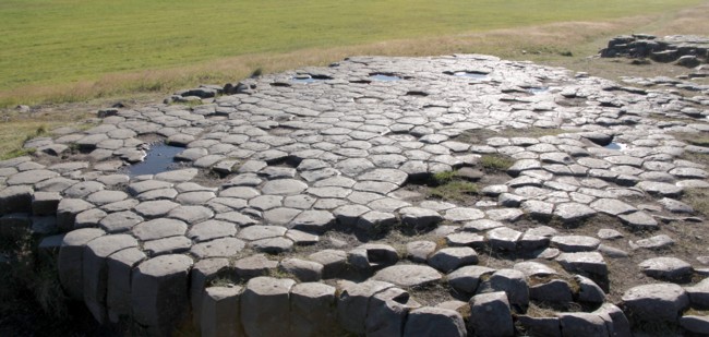 Il s'agit donc d'une surface formée (pas très grande) par le sommet de colonnes basaltiques érodées par la mer et les glaciers.