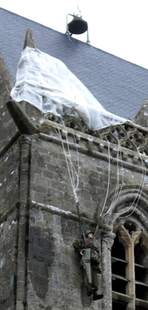 C'est dans l'un de ces largages que devint célèbre John Steele pour être resté accrocher au clocher de l'église pendant au moins deux heures, les cloches ne cessant alors de sonner le tocson.